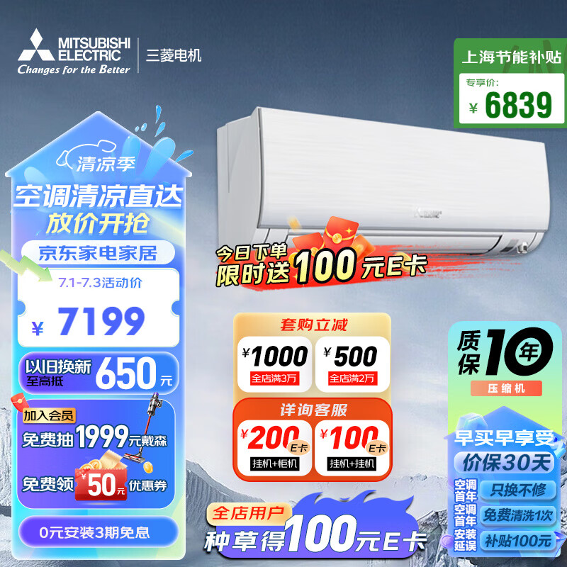 三菱电机10-15㎡适用以旧换新新一级能效1匹变频冷暖WIFI智能家用空调挂机开启式清洁一价全包MSZ-KY09VFK价格:7199.00元!