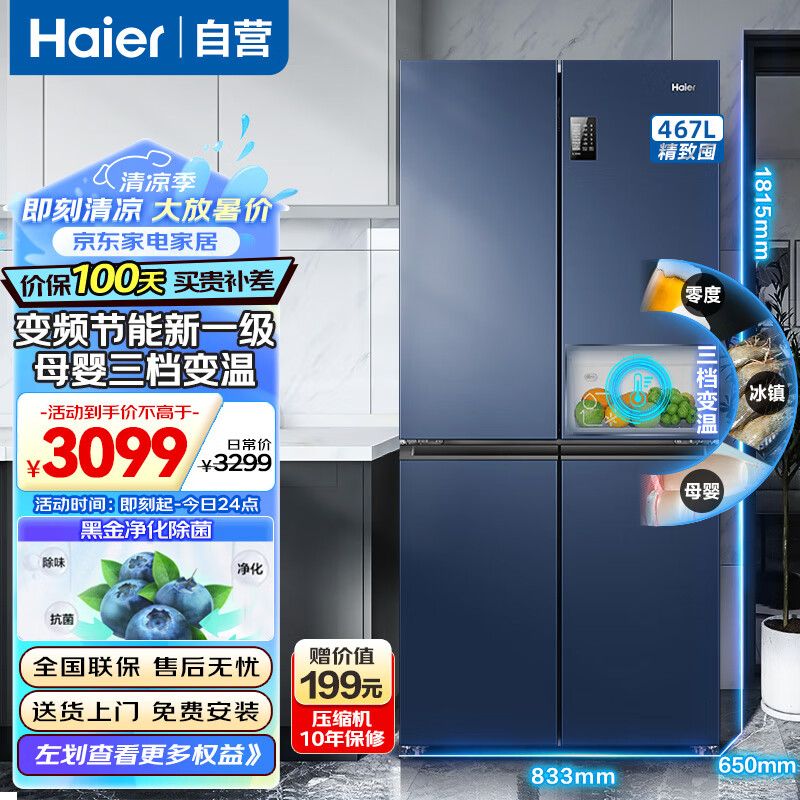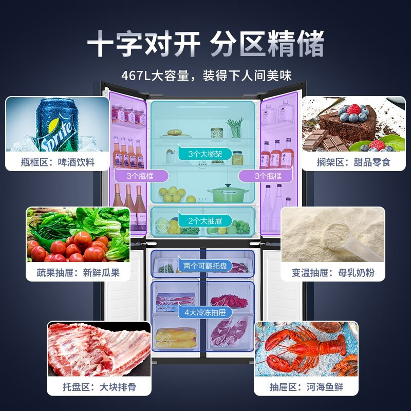 海尔(Haier)冰箱双开门四开门多门467升一级能效双变频风冷无霜家用超薄大容量十字门对开门电冰箱价格:3299.00元!