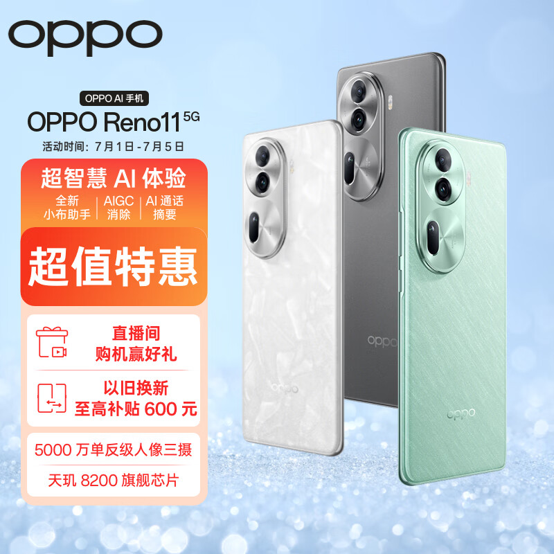 OPPO Reno11 5000万单反级人像三摄 天玑8200 旗舰芯 长续航 8GB+256GB 月光宝石 学生5G拍照 AI手机价格:2099.00元!