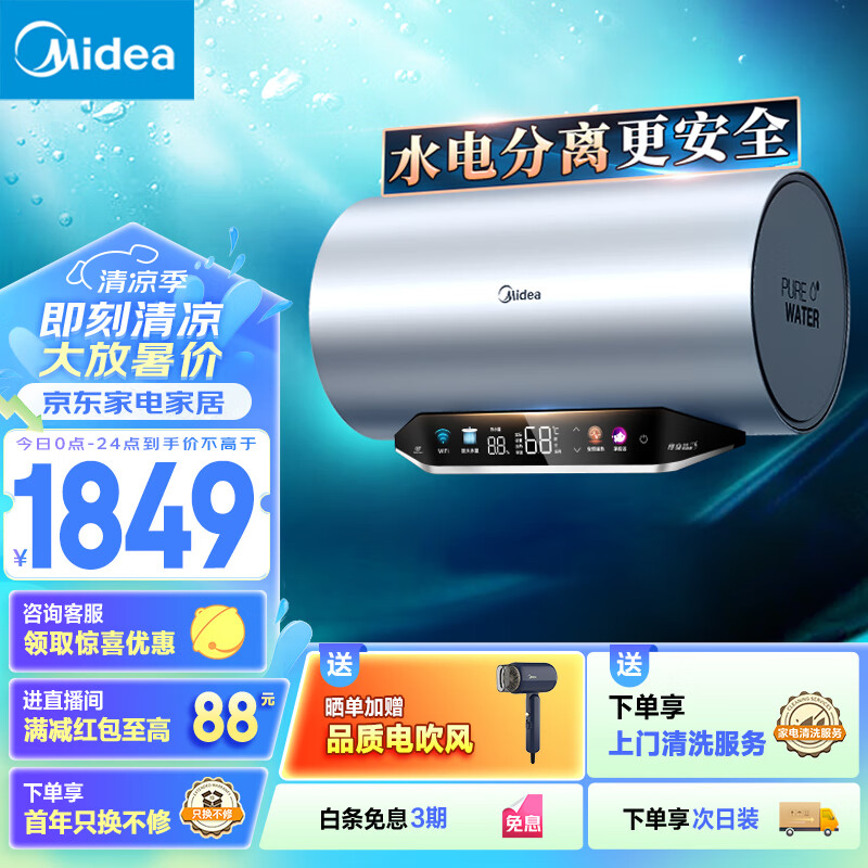 美的(Midea)水电分离80升电热水器家用 3300W变频 10重过滤净肤 瓷热舱内胆免清洗 以旧换新F8033-PE7pro(HE)价格:2049.00元!