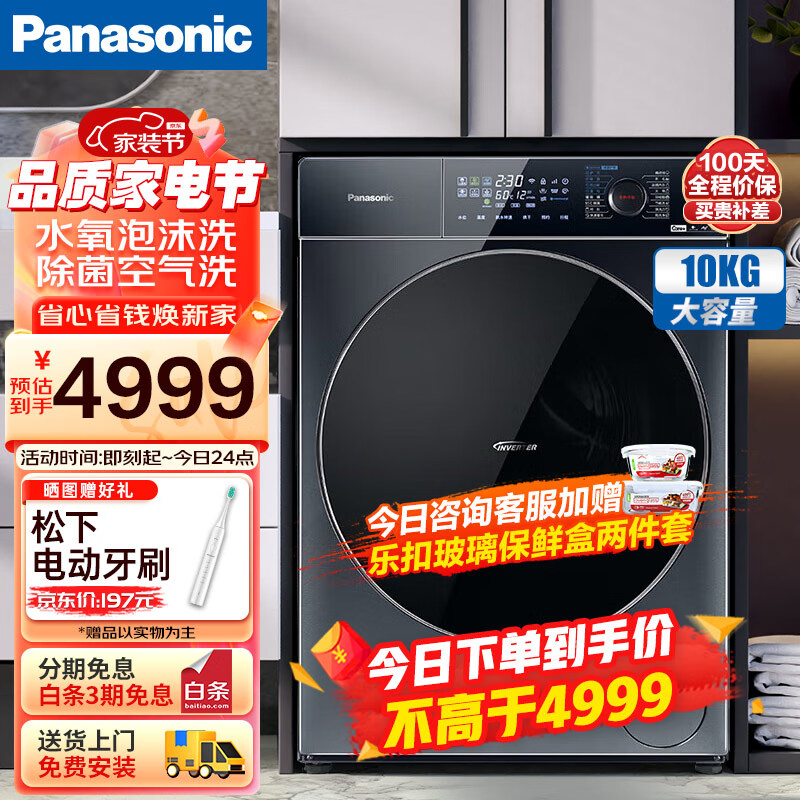 松下(Panasonic)滚筒洗衣机全自动洗烘一体10公斤 臻薄系列 天暮蓝超薄机身 水氧泡沫净除菌空气洗 XQG100-SD151价格:5499.00元!