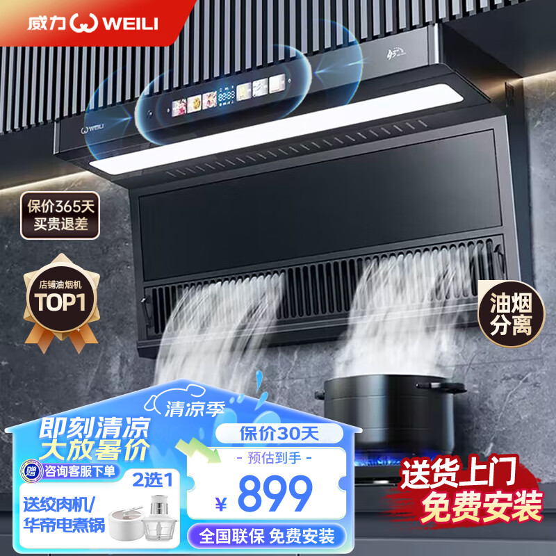 威力(WEILI)顶侧双吸油烟机家用7字型抽油烟机大吸力爆吸款28立方挥手感应 免拆洗家用烟机CXW-288-M05(Q07)价格:999.00元!