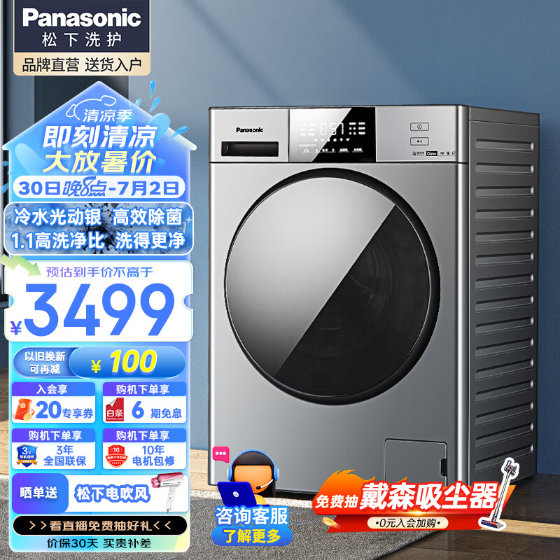松下(Panasonic)洗衣机滚筒全自动10公斤大容量 泡沫净 光动银常温除菌 BLDC变频电机 节能导航NAVC相似款 XQG100-N11C【光动银除菌】价格:3599.00元!
