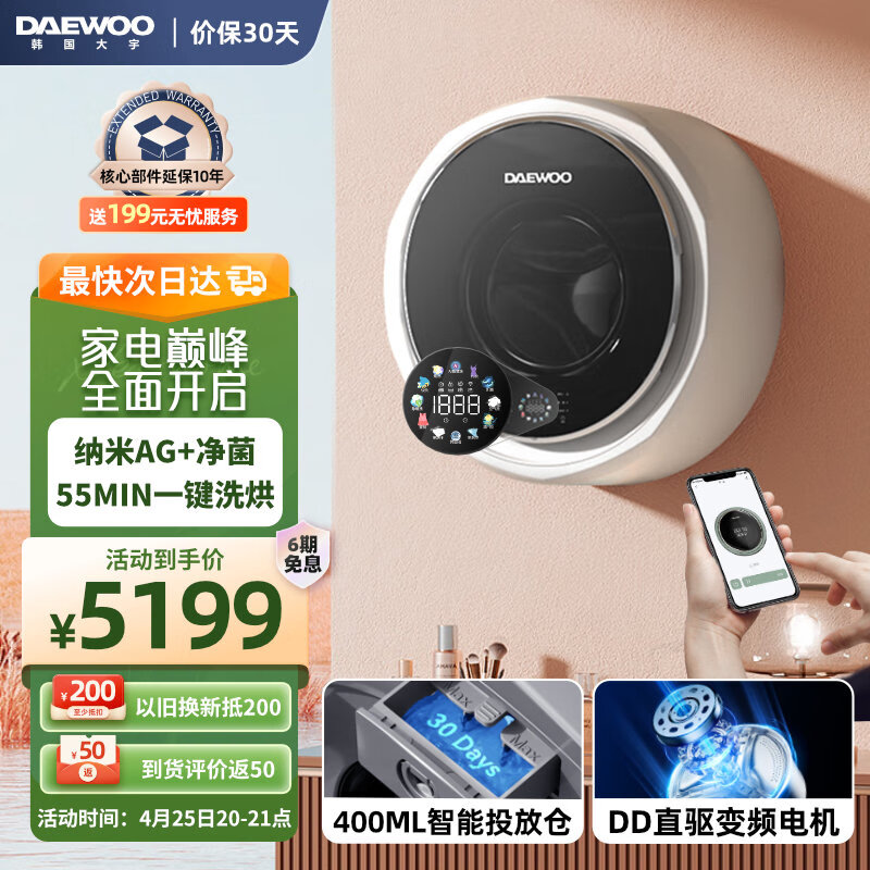 大宇(DAEWOO)壁挂洗衣机 洗烘一体 全自动变频3KG 彩屏WiFi智联 高温煮洗 星云系列 DY-BGX07H 皎月白价格:5499.00元!