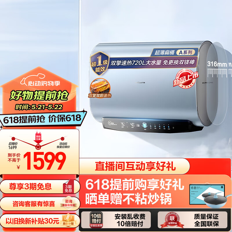 万和(Vanward)60升超薄扁桶电热水器出水断电双擎双胆速热3200W一级能效节能12倍增容镁棒免更换 E60-A6WW30-32价格:1699.00元!