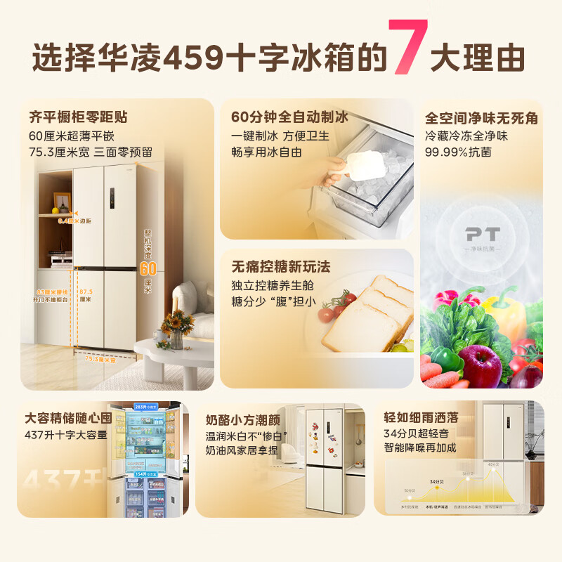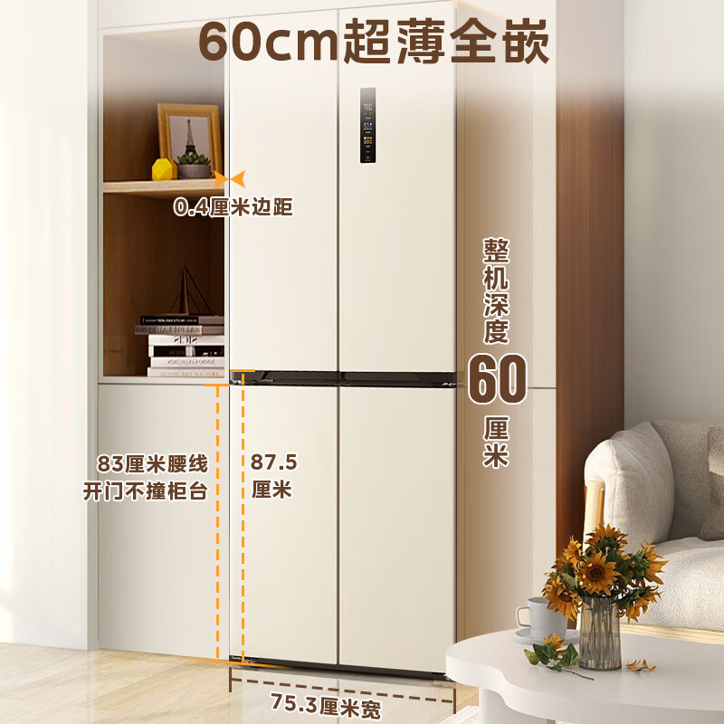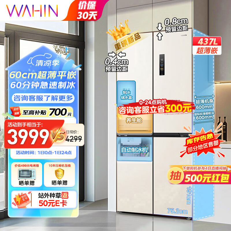 华凌60分钟急速制冰机身超薄十字四开门嵌入式一级能效家用智能风冷无霜电冰箱HR-459WUSIPZ价格:4299.00元!