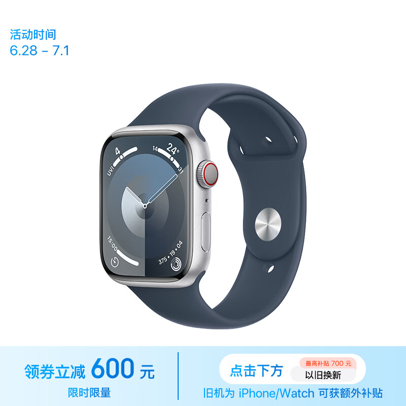 Apple/苹果 Watch Series 9 智能手表GPS+蜂窝款45毫米银色铝金属表壳风暴蓝色运动型表带S/M MRP83CH/A价格:3999.00元!