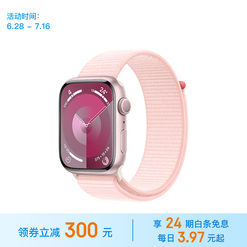 Apple【24期免息】Watch Series 9智能手表GPS款45毫米粉色铝金属表壳亮粉色回环表带MR9J3CH/A价格:3199.00元!
