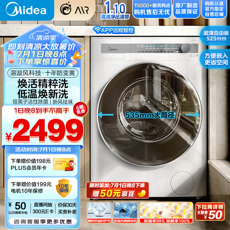 美的(Midea)滚筒洗衣机全自动 AIR系列 焕活精粹洗 超薄自由嵌 10公斤 1.1洗净比 银离子活性除菌 MG100AIR1价格:2499.00元!