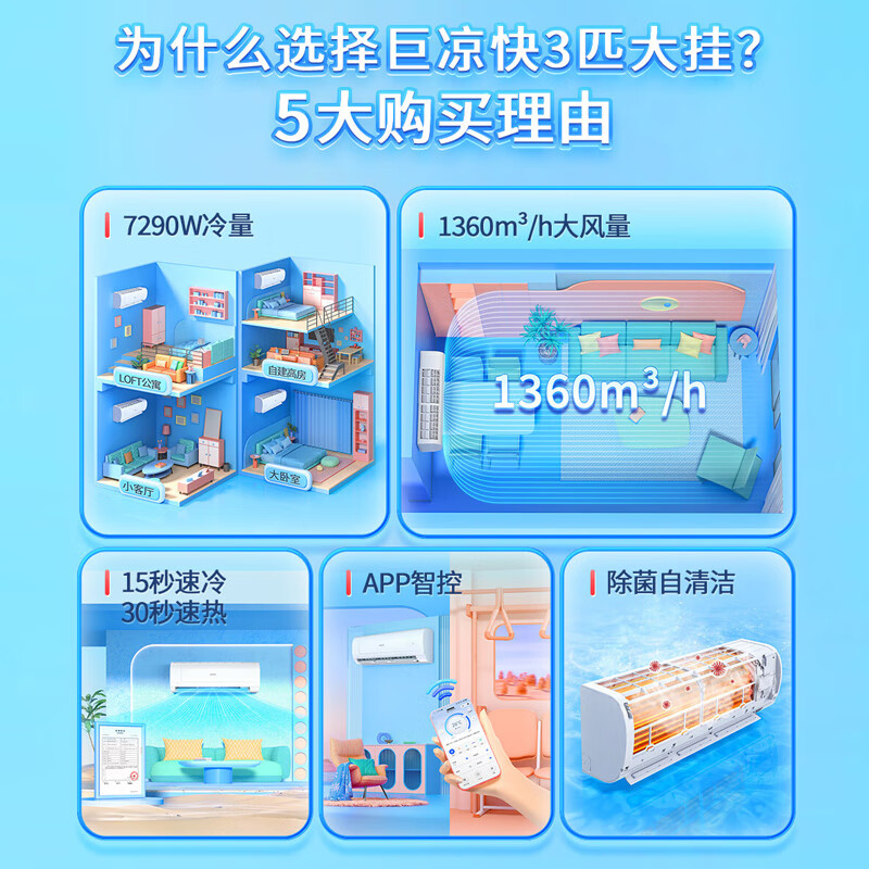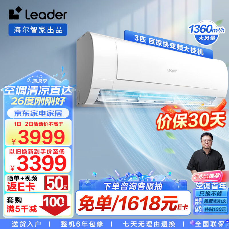 Leader空调 海尔智家出品 巨凉快3匹新三级变频空调挂机 自清洁壁挂式空调KFR-72GW/18MDA83TU1以旧换新价格:3999.00元!
