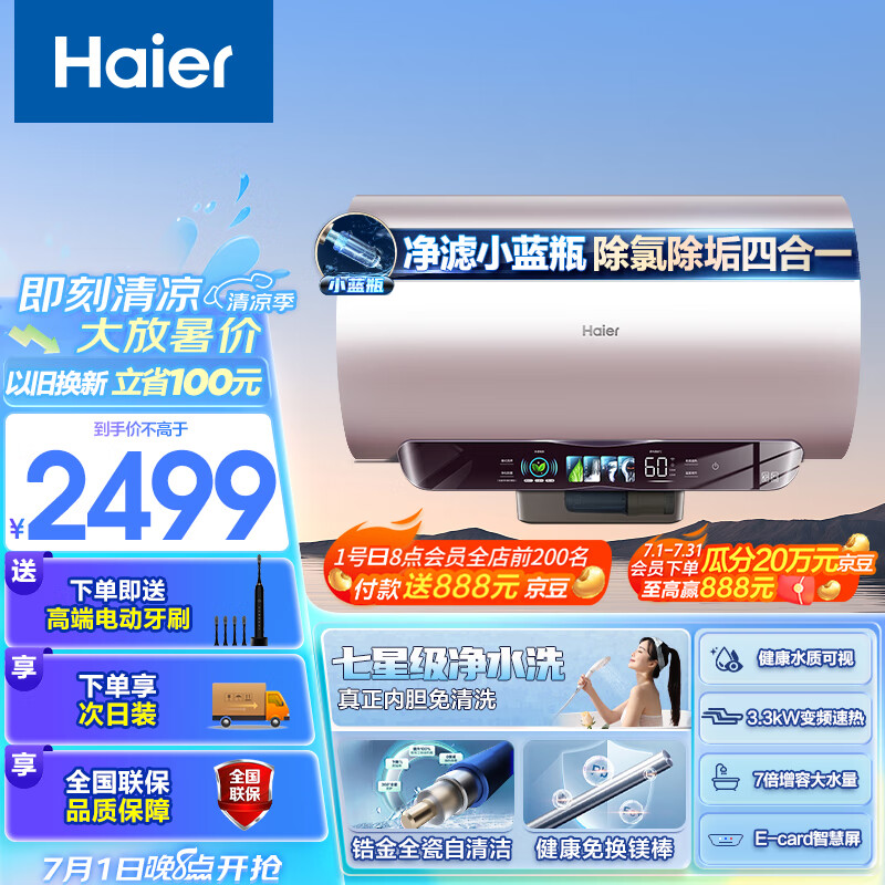 海尔(Haier)80升【小蓝瓶】净水洗瓷净电热水器家用储水式3300W变频速热免换镁棒大水量EC8002-WP3AU1以旧换新价格:2699.00元!