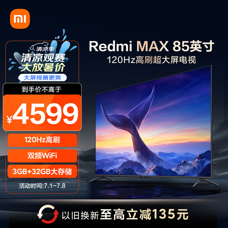 小米电视 85英寸 3+32GB大存储 120Hz高刷 屏 欧洲杯智能平板75英寸+电视机 Redmi MAX85 L85RA-RX价格:4599.00元!