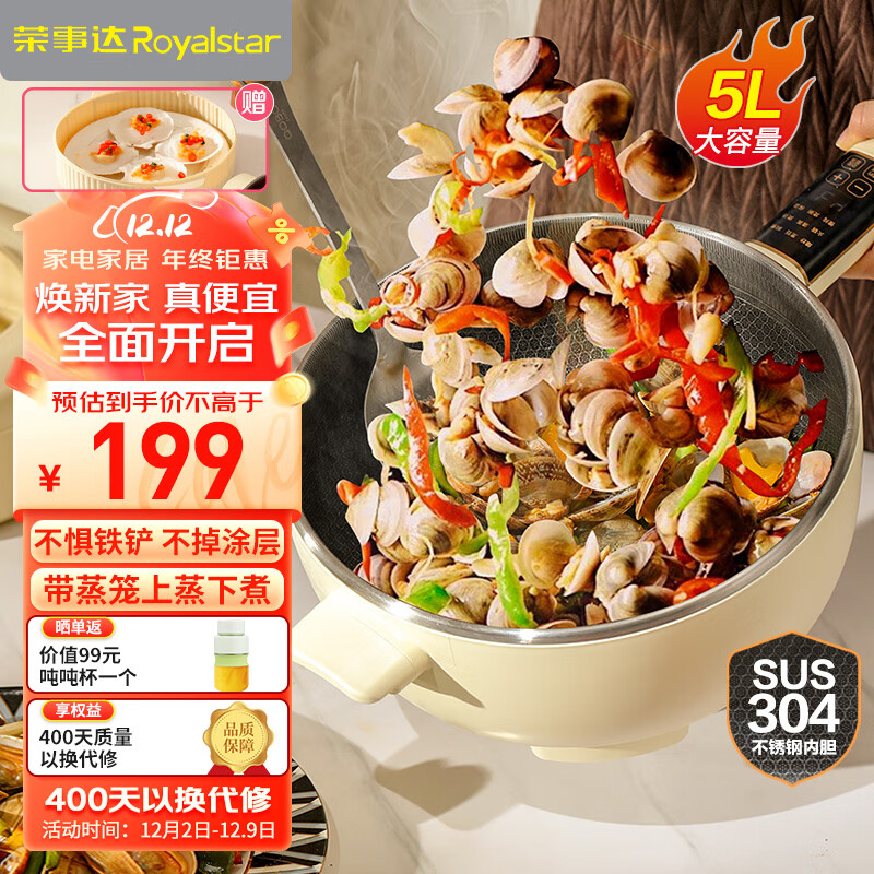 荣事达(Royalstar)电炒锅 不锈钢不粘锅一体锅电锅电煮锅多用途锅电炒菜锅电火锅电蒸锅多功能锅家用电煮锅 DCG1519价格:199.00元!