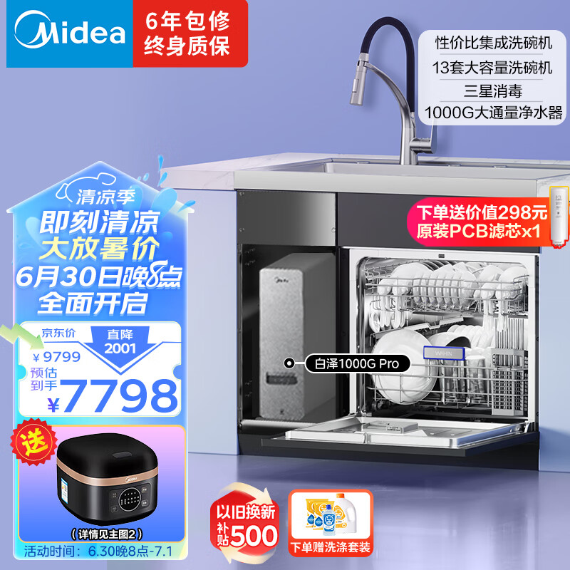 美的(Midea)集成净洗套装【集成水槽洗碗机XH03P+白泽1000G pro净水器】一级水效 5年RO反渗透过滤器价格:7798.00元!