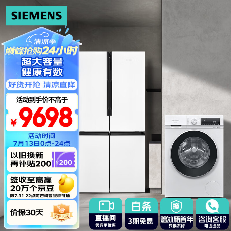 西门子(SIEMENS)冰洗套装605L超大容量十字门冰箱+10kg除渍洗K56L20CMEC+WG52A100AW价格:9698.00元!
