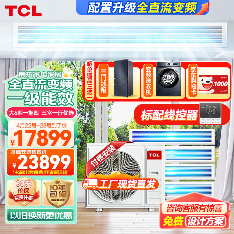 TCL中央空调大6匹一拖四风管机嵌入式空调家用多联机全直流变频新一级能效 三室一厅 TMV-Vd160W/N1-D价格:19999.00元!