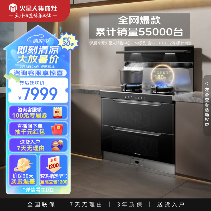 火星人 ET50BX消毒柜款集成灶 大风量超柔声 二消毒柜 液化气价格:8099.00元!