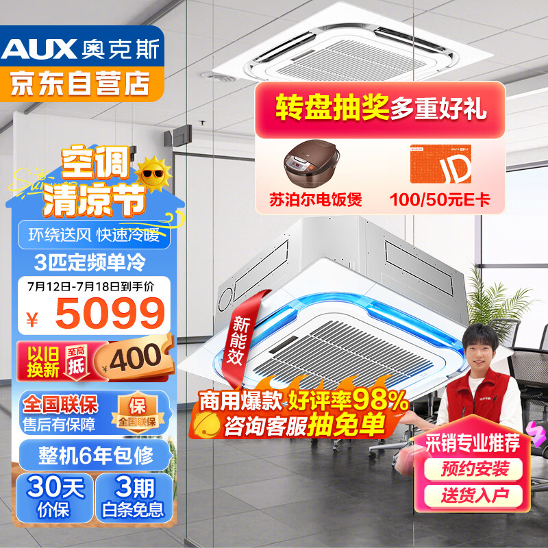 奥克斯(AUX)中央空调一拖一 3匹天花机嵌入式吸顶机单冷新能效吊顶商用天井机220V KF-72QW/R3YC2(B3)厂发价格:5099.00元!