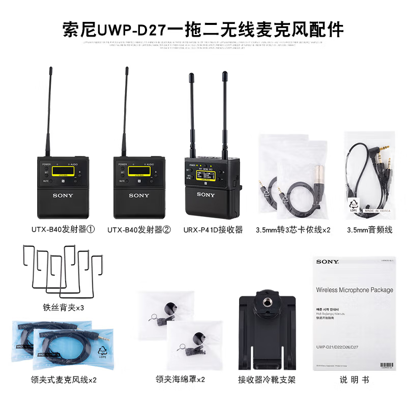 索尼 SONY 小蜜蜂UWP-D27 直播设备 领夹式无线麦克风话筒 一拖二套装(URX-P41D*1+UTX-B40*2)价格:7829.10元!