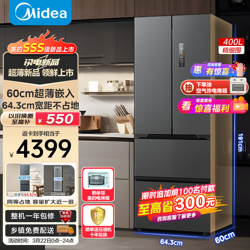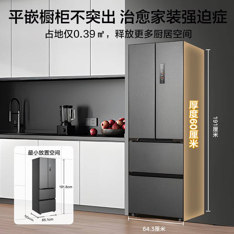 美的(Midea)60cm嵌419法式多门四开门电冰箱超薄零嵌入式一级变频小户型大容量无霜家用净味智能MR-419WUFPZE价格:4999.00元!