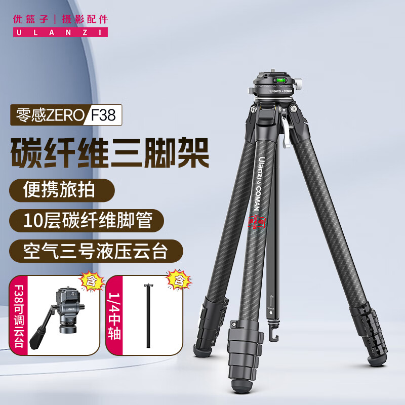 优篮子ulanzi 零感ZERO F38碳纤维三脚架(液压云台套装)户外旅行便携三角架相机单反直播支架价格:1739.00元!