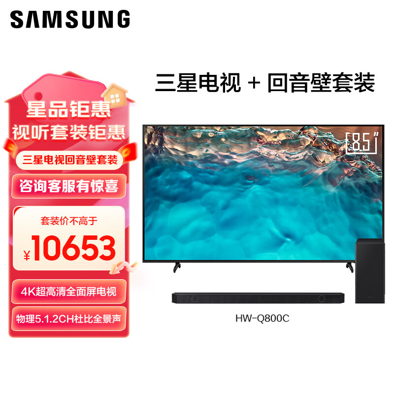 三星(SAMSUNG)85CU8000+Q800C杜比全景声 DTS:X 家庭影院 电视音响回音壁 大屏电视 无线回音壁价格:10653.00元!