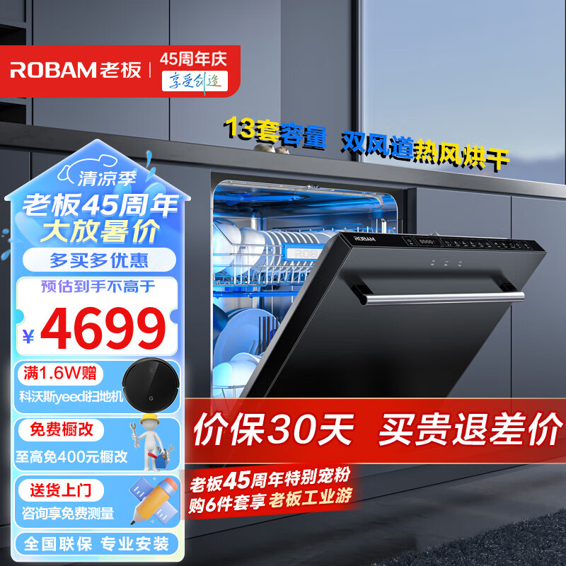 老板(Robam)WB795X嵌入式洗碗机13套容量嵌入式去重油污热风烘干消毒存储一体机一级水效分层洗家用洗碗机 变频节能还能洗锅价格:4699.00元!