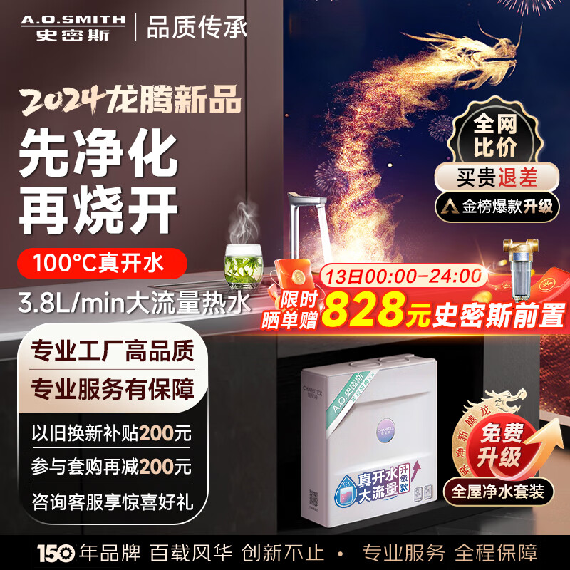 史密斯(A.O.SMITH)佳尼特【24年龙腾上新】加热净水器厨下家用净水机3.8升/分钟CDR2000F【FA1升级款】价格:5599.00元!