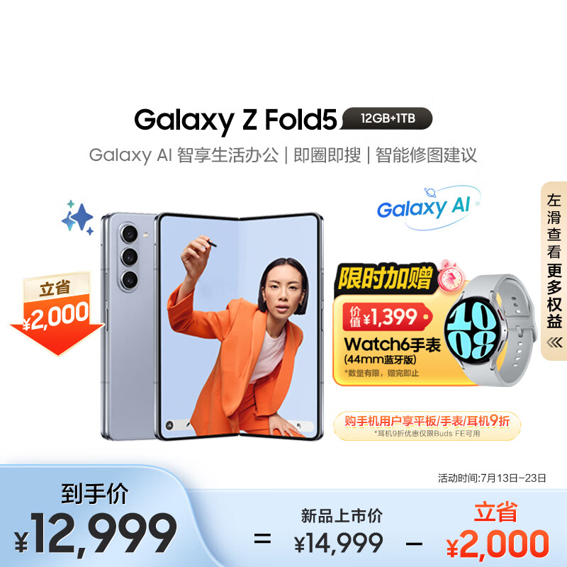 三星(SAMSUNG)Galaxy Z Fold5 AI手机 超闭合折叠手机 同声翻译 智能修图摄像 12GB+1TB 冰萃蓝 5G折叠屏手机价格:12999.00元!