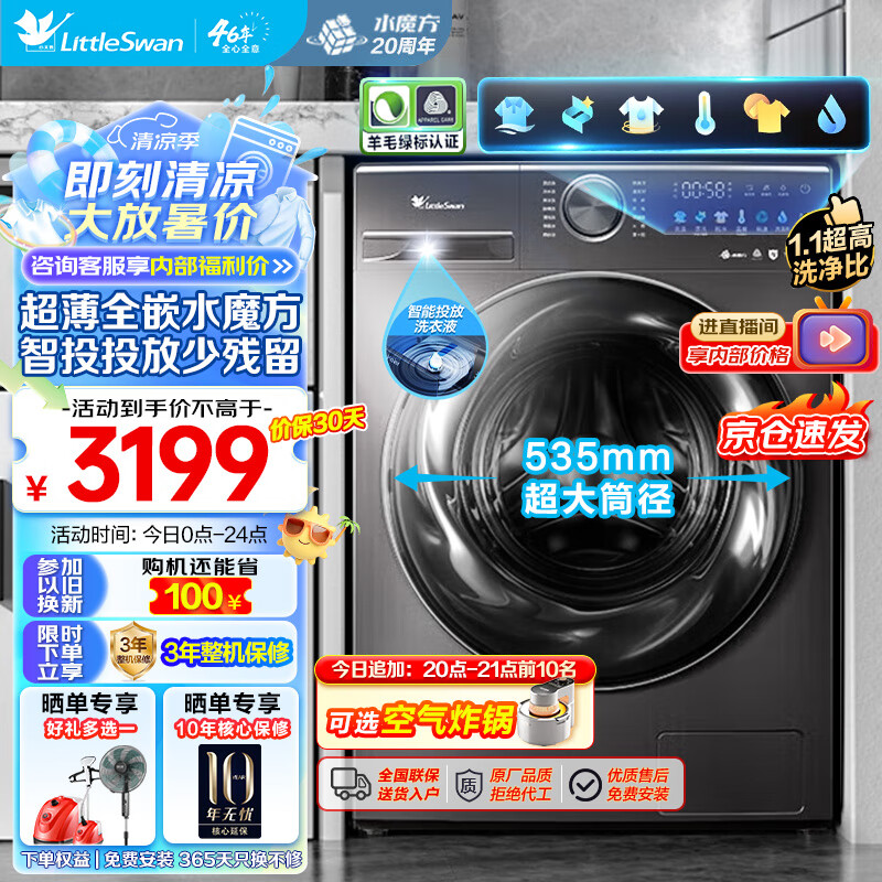 小天鹅(LittleSwan)小乌梅洗衣机滚筒10公斤全自动水魔方智能投放1.1高洗净比超薄全嵌旗舰羊毛绿标轻享版M18T价格:3199.00元!