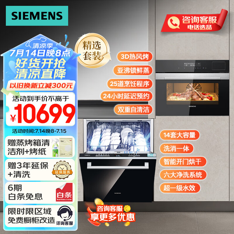 西门子(SIEMENS)全自动家用嵌入式洗碗机636pro 蒸烤一体机套装 14套大容量 CS389ABS0W+SJ63EX00KC(含黑门板)价格:10698.00元!