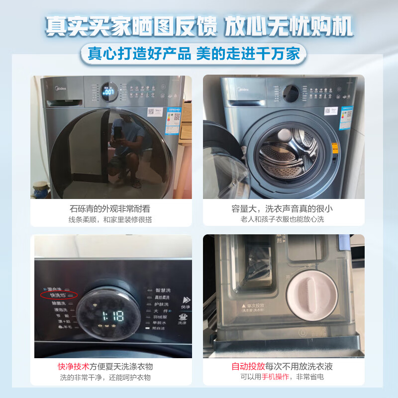 3、洗衣机今天送到了,联系美的售后师傅后,小哥半个小时不到就来安装好了。洗衣机整体很好很满意。外形外观:外观大气容量大小:十公斤家庭使用正好