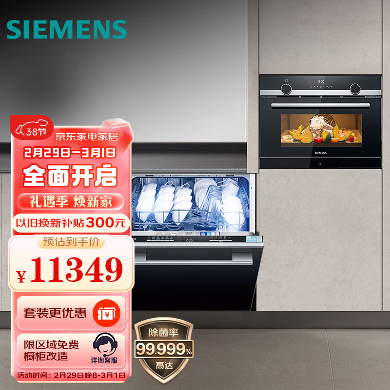 西门子洗嵌套装 12套大容量灶下大内腔嵌入式洗碗机+嵌入式微蒸烤炸一体机组合套装 SE43E+CP565AGS1W价格:11349.00元!