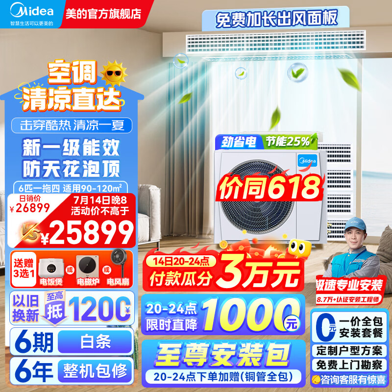 美的(Midea)中央空调一拖四风管机6匹多联机星光全直流变频新一级能效智能冷暖清洁嵌入式隐形嵌系列MDS三代价格:26999.00元!