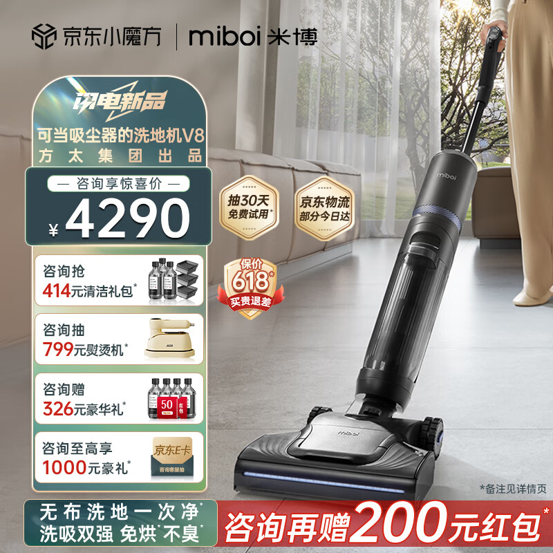 米博(Miboi)【20+明星推荐】无滚布洗地机V8黑武士家用洗拖吸拖地智能除螨除菌自洁扫地吸尘方太集团出品价格:4290.00元!