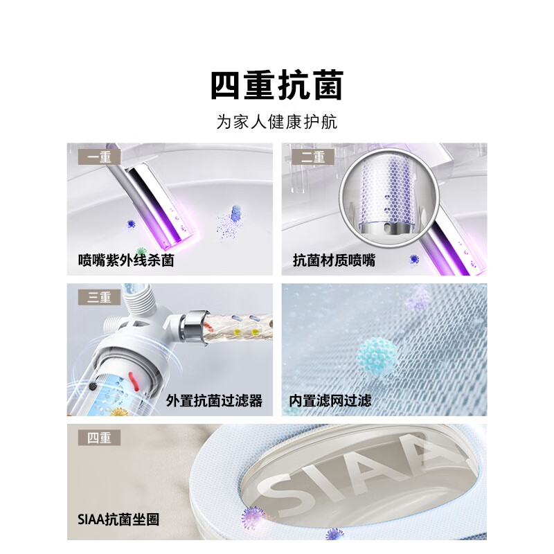 功能:暖风烘干,按摩清洗,臀部清洁,座圈加热,喷嘴自洁,女性清洗,喷嘴移动清洗,净化水质,水温调节,风温调节,坐温调节,柔和夜灯