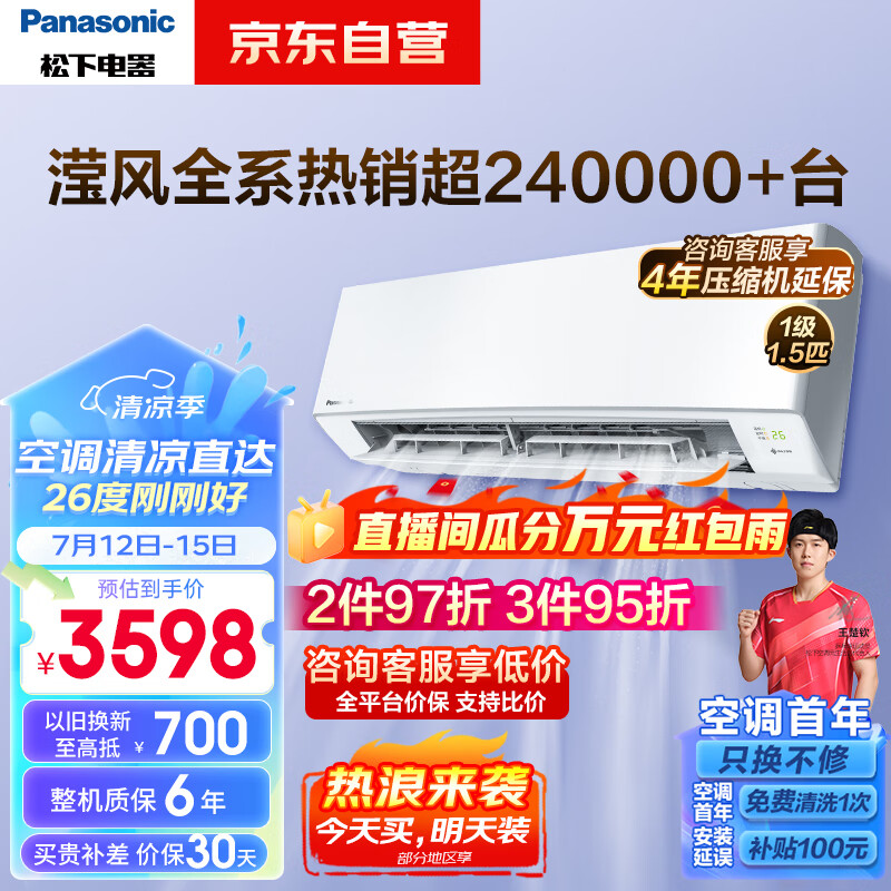 松下空调滢风系列 1.5匹 新一级能效 变频冷暖两用空调挂机 高温杀菌 WiFi智能 ZY35K210 以旧换新价格:3398.00元!