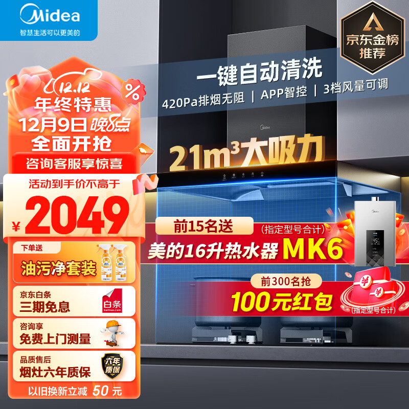 美的(Midea)抽油烟机灶具套装 家用欧式21大风量自动清洗吸烟机 5kW铜火盖燃气灶T201+Q230A液化气价格:2149.00元!