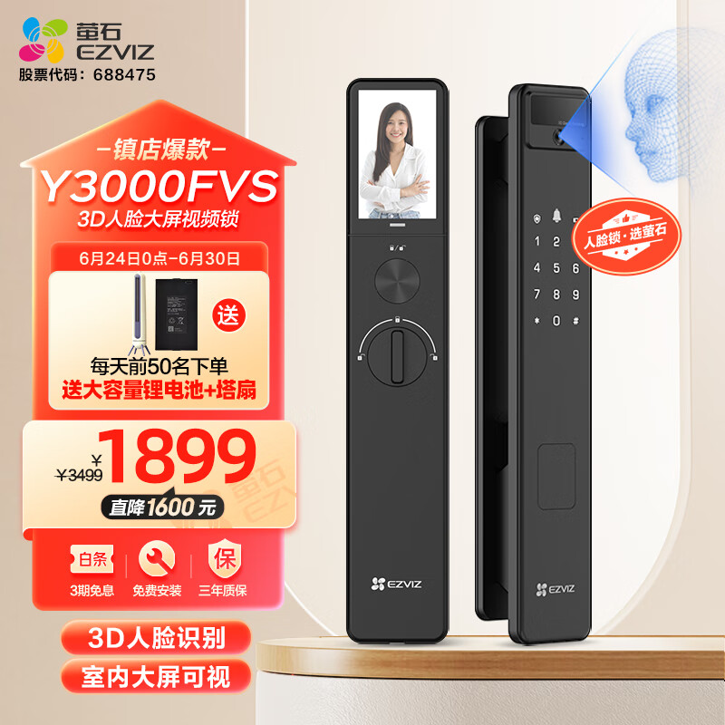 萤石Y3000FVS智能锁 静谧黑 3D人脸识别无需指纹 室内4英寸可视大屏 家用全自动猫眼门铃防盗视频锁价格:1899.00元!