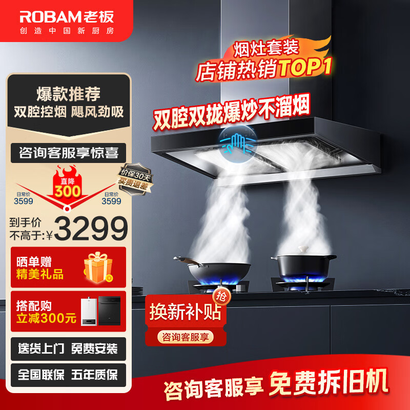 老板(Robam)抽油烟机 欧式顶吸式21立方大吸力双腔家用吸油烟机挥手智控家用燃气灶 烟机灶具60X2套装 (灶具天然气)价格:3299.00元!