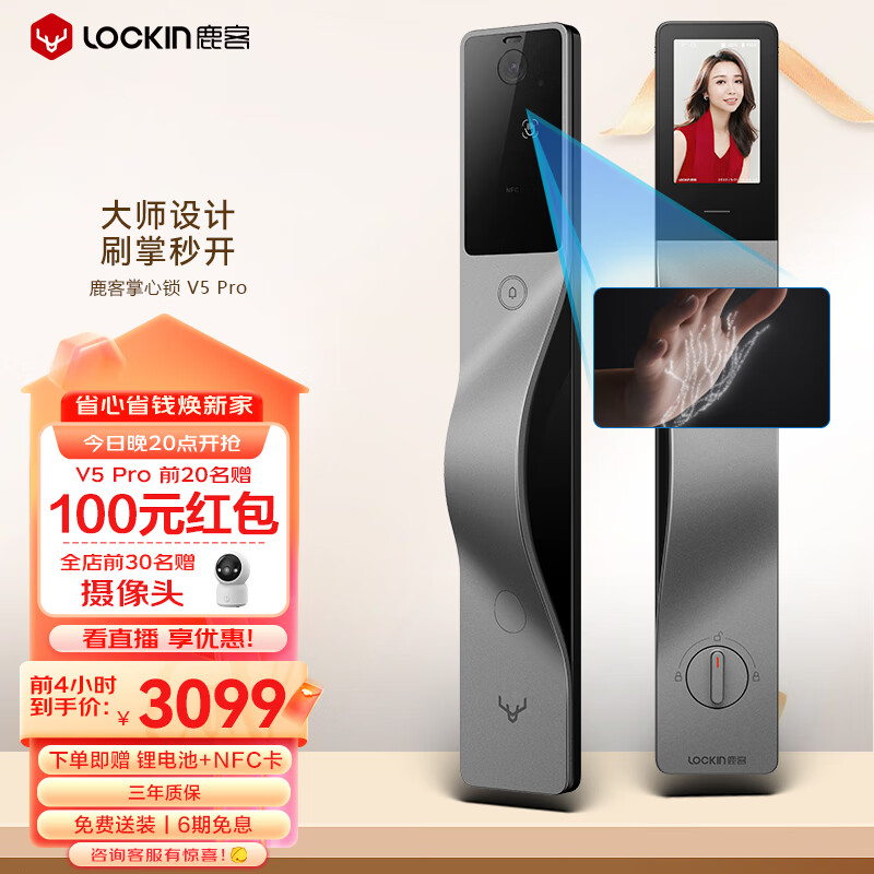 鹿客(lockin)掌心锁V5 Pro掌静脉识别猫眼大屏电子锁指纹锁APP智联适用右开价格:3299.00元!