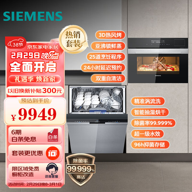西门子(SIEMENS)洗嵌套装 14套嵌入式家用洗碗机 +嵌入式蒸烤一体机组合套装 SJ43HS00KC+CS389ABS0W价格:9949.00元!