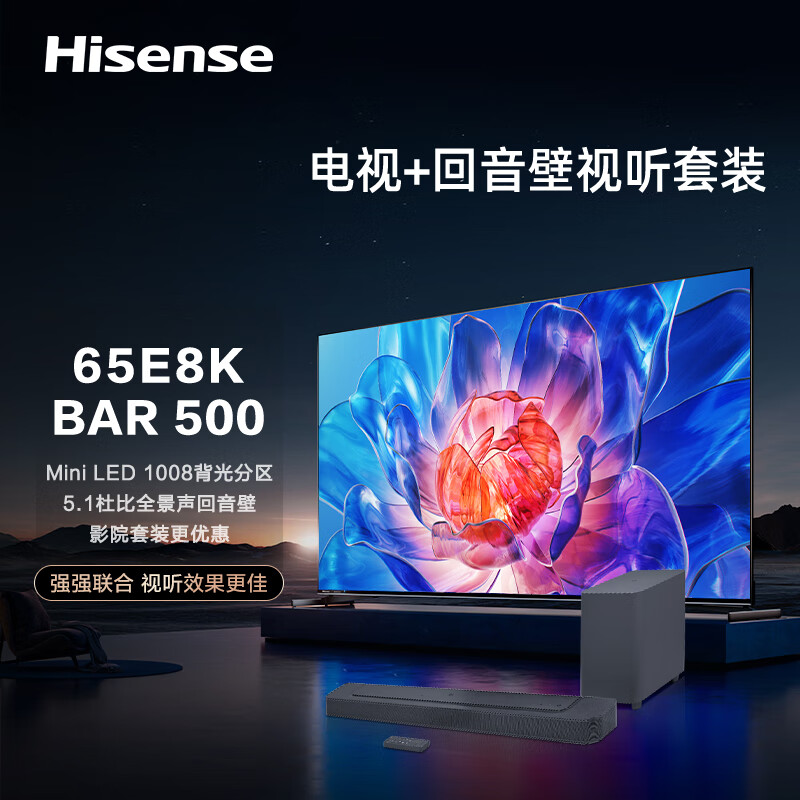 海信电视65E8K+Bar500沉浸追剧套装 65英寸 ULED X Mini LED 1008分区控光 4K 144Hz 液晶平板电视机价格:10098.00元!
