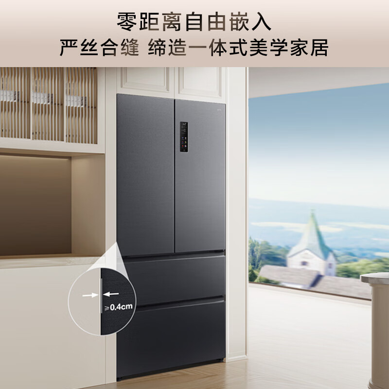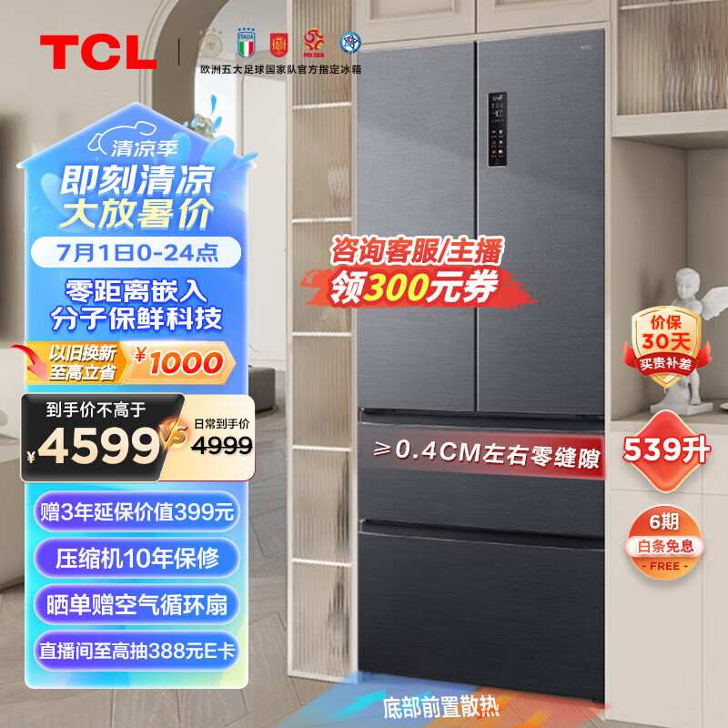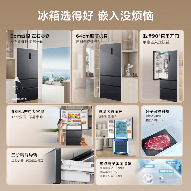 TCL 539升T9法式四门超薄零嵌入式冰箱底部散热分子保鲜杀菌除味双循环一级能效家用电冰箱R539T9-DQ价格:4899.00元!