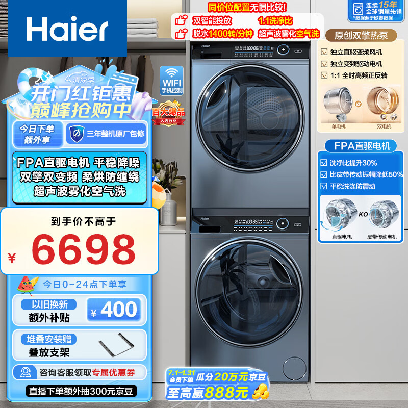 海尔(Haier)纤美176洗烘套装 10KG直驱滚筒洗衣机全自动+双擎热泵烘干机家用组合 BD14176+176 以旧换新价格:6698.00元!