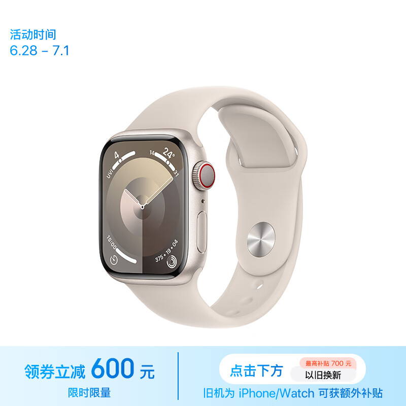 Apple/苹果 Watch Series 9 智能手表GPS+蜂窝款41毫米星光色铝金属表壳星光色运动型表带S/M MRJE3CH/A价格:3799.00元!