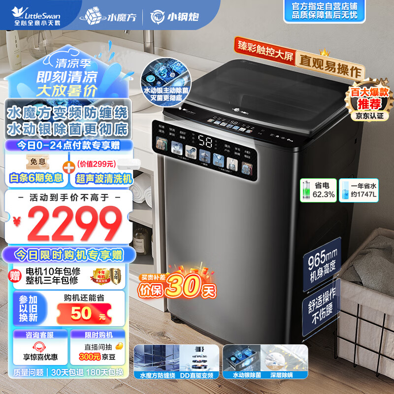小天鹅波轮洗衣机全自动 小钢炮【TB100V83PLUS】水魔方防缠绕 水动银99%除菌 直驱变频 炫彩大屏 10公斤价格:2299.00元!