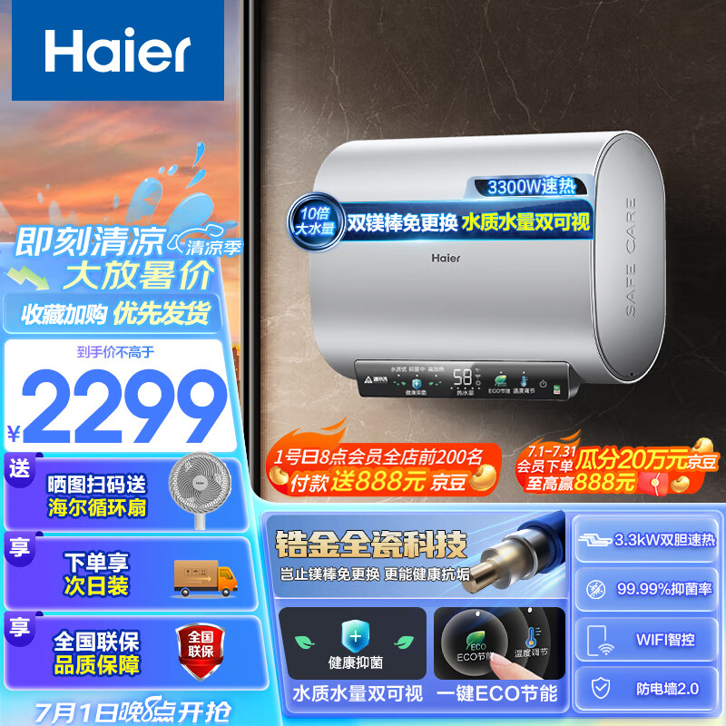 海尔(Haier)60升【小魔盒BK1】超薄扁桶双胆电热水器家用储水式3300W大功率速热 EC6001HD-BK1银U1 以旧换新价格:2499.00元!