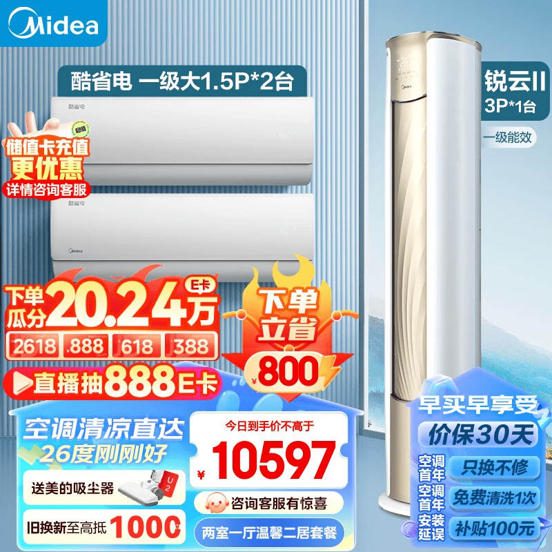美的(Midea)温馨二居套餐 套购一站式 锐云2代空调套装 (1.5匹酷省电一级*2+3匹锐云)价格:11397.00元!