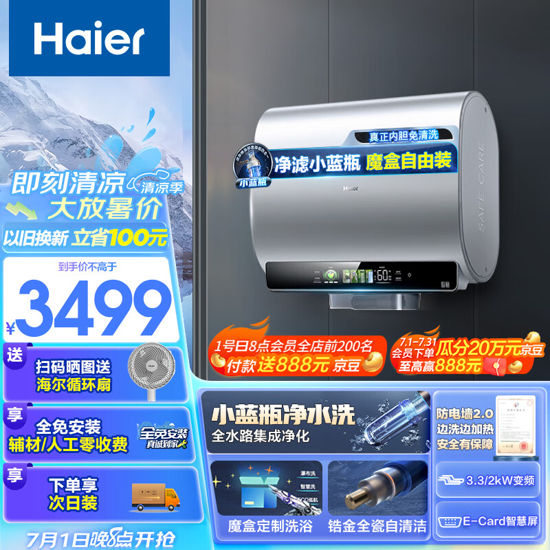 海尔(Haier)80升【小魔盒BK5】小蓝瓶净水洗超薄扁桶双胆家用电热水器3300W变频速热EC8003HD-BK5AU1 以旧换新价格:3799.00元!